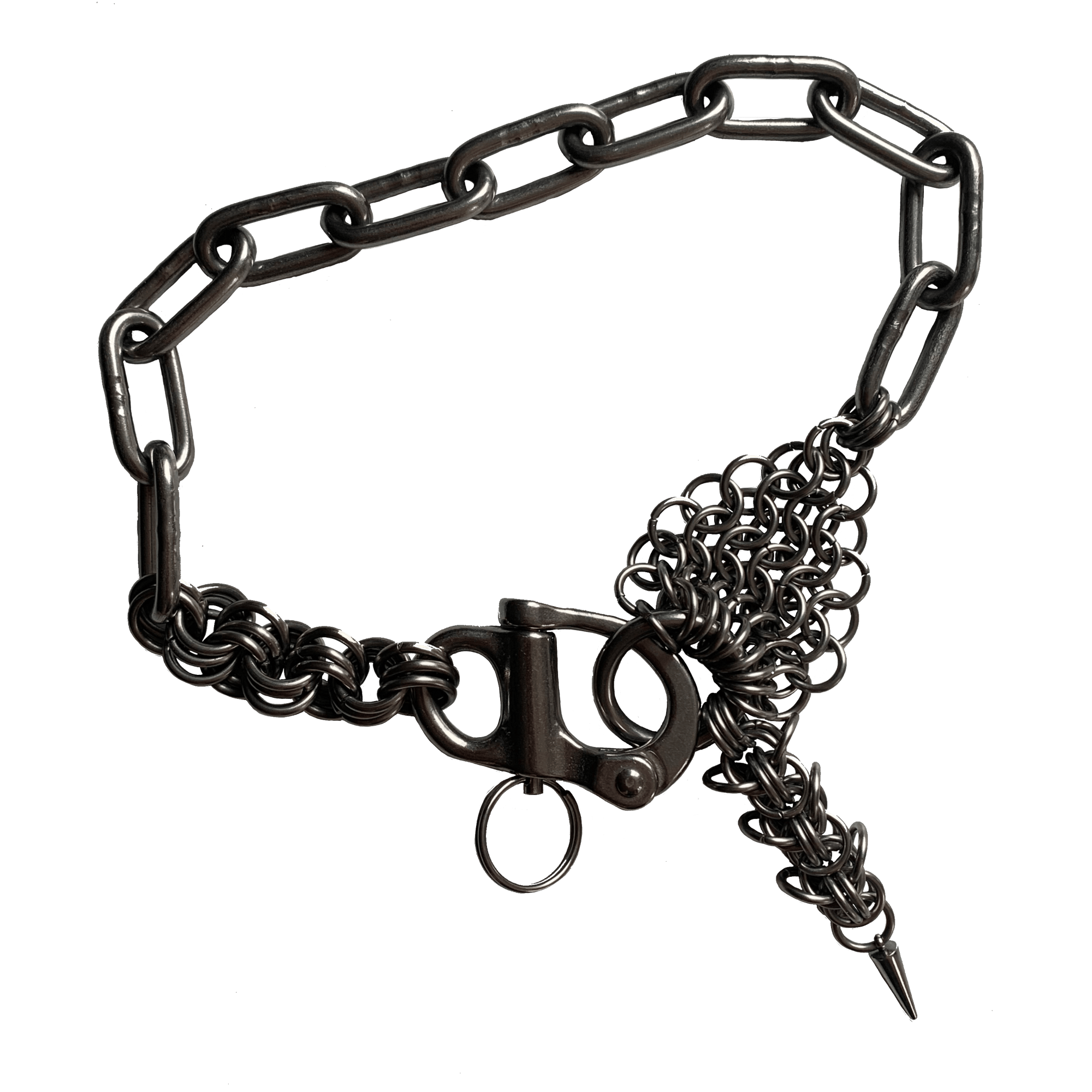 Front closure asymmetrical collar in entirely stainless steel. Handmade chainmail necklace perfect for casual wear or play. Please message for sizing.